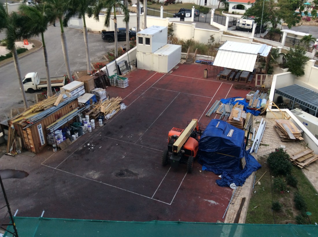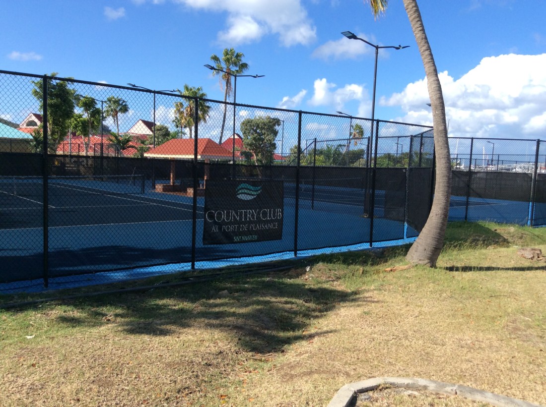 Je me suis arrêté au Rainbow Beach Club ce matin et j’ai parlé à leur responsable. Ils ont un court de tennis sur le toit mais il a été endommagé lors de l’ouragan Irma (alias La Bitch) et n’a pas encore été réparé.